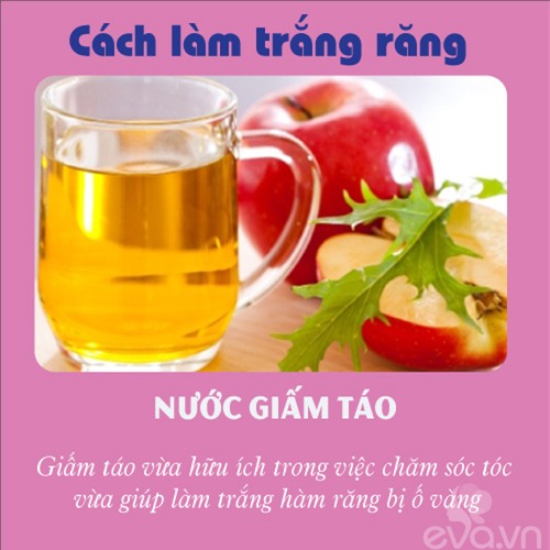 Không chỉ có tác dụng trong việc làm đẹp tóc, giấm táo còn giúp răng trắng sáng và bóng khoẻ hơn. Hãy súc miệng với giấm táo hàng ngày trước khi đánh răng. Bạn sẽ bất ngờ với hiệu quả mà nó mang lại.
