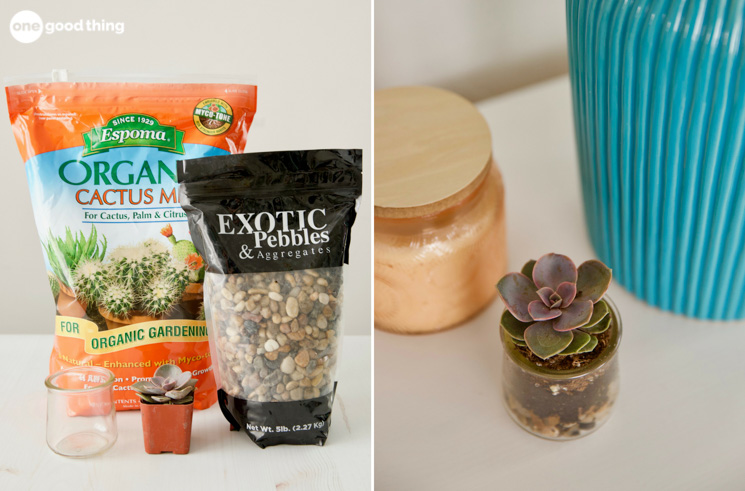 Lấp đầy sỏi bằng 1/3 hũ sữa chua, sau đó đến cát và một chút đất để trồng cây cảnh. Bạn có thể trồng các loại cây như xương rồng, bầu đất giống hoặc cây trồng nào mà bạn yêu thích.