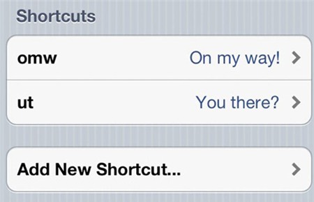 Có những từ bạn thường xuyên sử dụng lại nhiều lần nhưng lại không thể gõ nhanh như mong muốn? Bạn có thể vào phần Settings, chọn General, Keyboard sau đó chọn Add New Shortcut. Chẳng hạn bạn có thể chọn gõ "brb" là viết tắt của "be right back" và trong những lần sau, bạn chỉ phải gõ "brb", thay vì gõ đầy đủ để tiết kiệm thời gian.