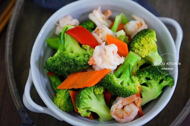 Sơ chế tôm, ướp trong vài phút. Chuẩn bị bông cải xanh, ớt chuông, cà rốt, cho vào nồi đun sôi, chần rau củ trong vài phút. Phi thơm hành tỏi, cho tôm vào xào nhanh trước, sau đó cho rau củ vào, nêm nếm lại gia vị.