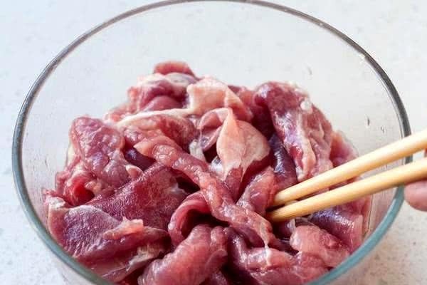 Thịt ba rọi xắt mỏng, ướp với hành, tiêu, tỏi, nước mắm rồi cho vào chảo xào.