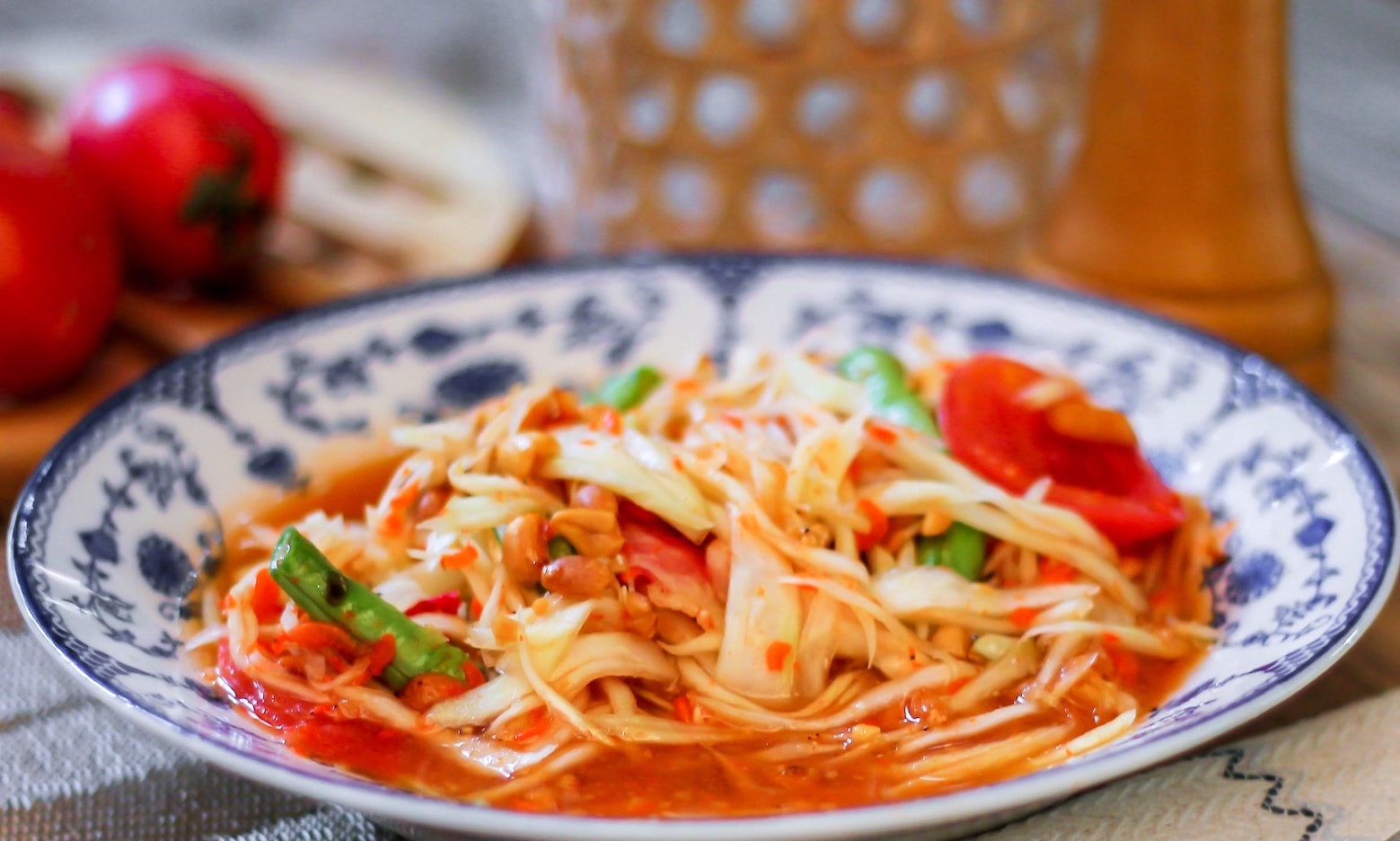 Gỏi đu đủ xanh: Vị ngọt của đường thốt nốt, chua từ chanh, cay bởi ớt, nồng từ tỏi, bùi mặn của đậu phộng kết hợp đu đủ xanh, đậu que, cà chua và rau mùi tùy thích tạo nên món gỏi đặc trưng. Điểm nhấn nằm ở việc nguyên liệu được trộn bằng cách giã cối kiểu truyền thống, giúp làm dậy hương vị một cách tự nhiên. Cho gỏi ra đĩa rồi rắc thêm rau mùi, lạc rang chín giã dập lên trên và thưởng thức. Ảnh: Sirasit gullasu/Unsplash.