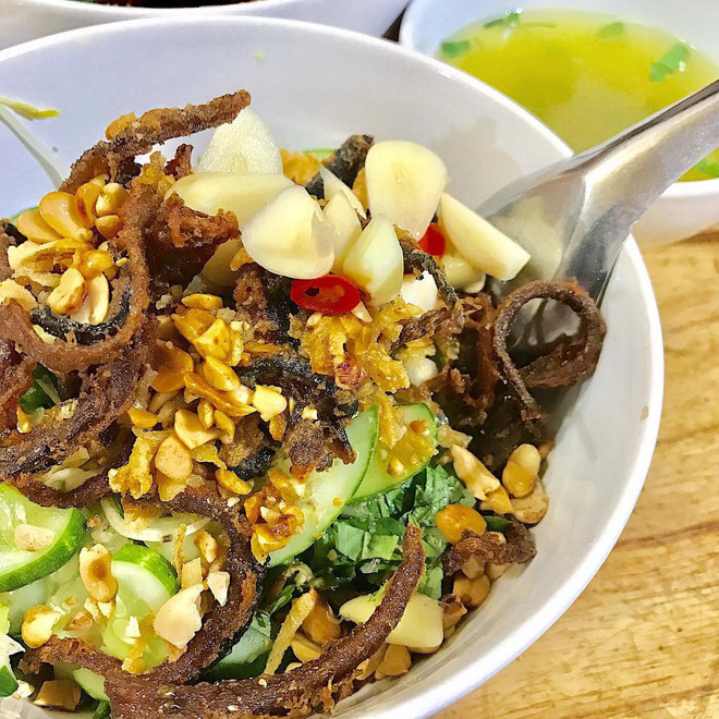 Nếu không phải fan của thịt, hay đơn giản là muốn tìm một món trộn ăn lạ miệng, mời mẻ hơn thì đừng bỏ qua món miến trộn mực. Thay vì các loại thịt lợn, bò, gà, linh hồn của món này là mức khô xé sợi chiên giòn, dai lại hạn chế được mùi tanh. Song song với đó là chả chiên, giò, trứng chiên thái nhỏ và tất nhiên không thể thiếu rau chần.