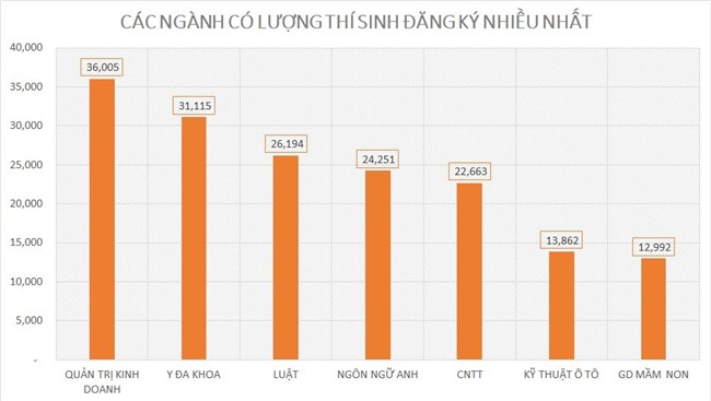 Thống kê theo ngành thì ngành quản trị kinh doanh là ngành được nhiều thí sinh lựa chọn nhất với 36.005 thí sinh đăng ký ở nguyện vọng 1.
