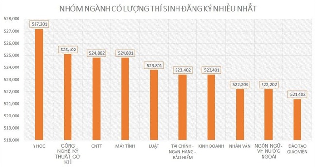 Nếu tính lượng thí sinh có đăng ký nguyện vọng đại học phân theo các nhóm ngành thì ngành y học có số lượng thí sinh đăng ký đông nhất với 527.201 lượt thí sinh.