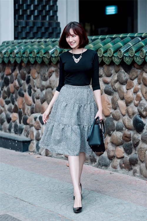 Chân váy len dài, với thiết kế 3 tầng lạ mắt, phối cùng áo dáng ôm dài tay mang lại nét kín đáo, dịu dàng mà ấm áp cho những ngày giao mùa.