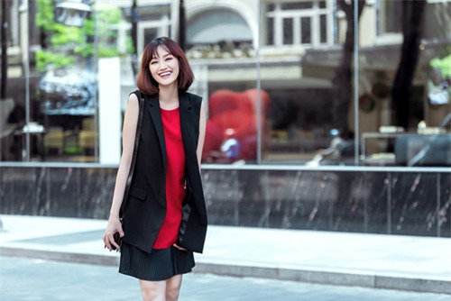 Màu đỏ nổi bật và ấm áp một lần nữa là điểm nhấn trong trang phục xuống phố những ngày giao mùa của Trúc Diễm.