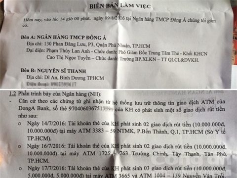 Trong biên bản làm việc ngày 9-8 có chữ ký của đại diện 2 bên, phần trình bày của Ngân hàng Đông Á nêu rõ: “Căn cứ theo các chứng từ ghi nhận từ hệ thống lưu trữ thông tin giao dịch ATM của DongA Bank, số thẻ 970406036751XXXX có phát sinh một số giao dịch rút tiền.