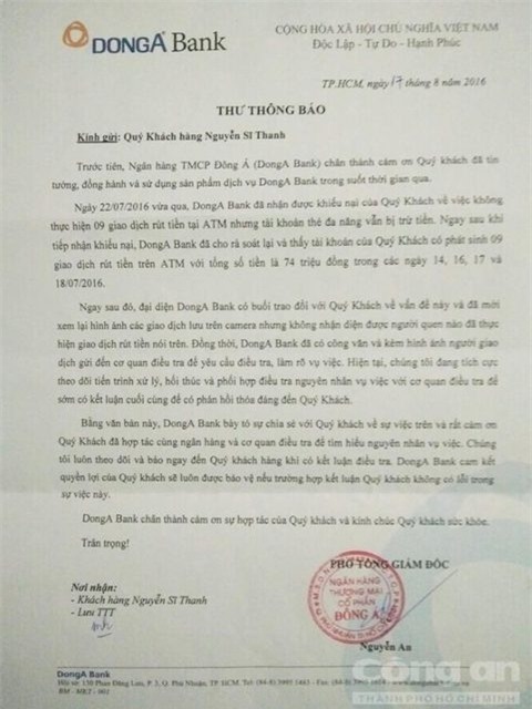 DongA Bank có công văn và kèm hình ảnh người giao dịch gửi đến cơ quan điều tra để yêu cầu điều tra, làm rõ vụ việc. Hiện tại, chúng tôi đang tích cực theo dõi tiến trình xử lý, hối thúc và phối hợp điều tra nguyên nhân vụ việc để sớm có kết luận cuối cùng để phản hồi thoả đáng đến Quý khách... DongA Bank cam kết quyền lợi của Quý Khách sẽ luôn được bảo vệ nếu trường hợp kết luận Quý khách không có lỗi trong sự việc này”.