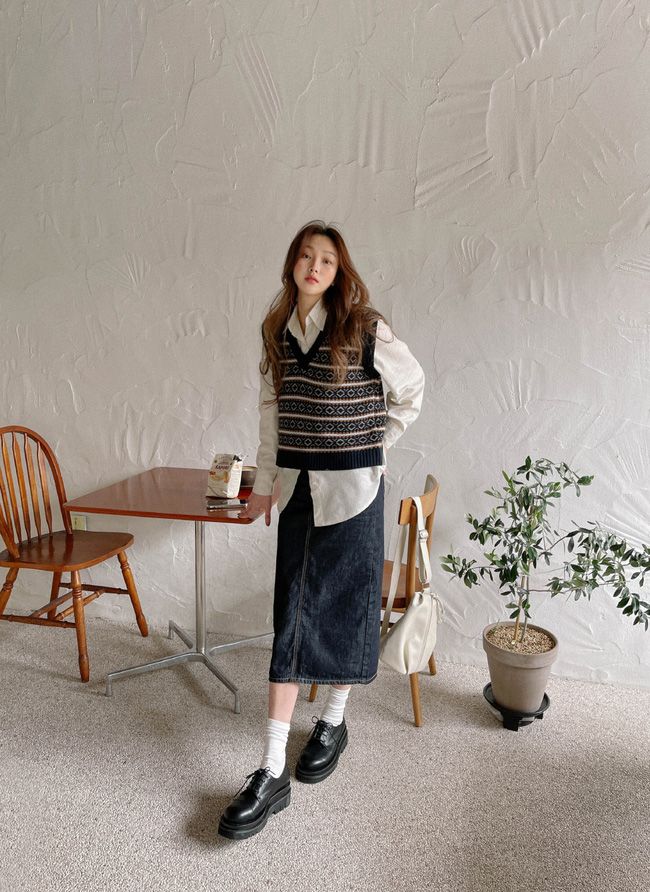 Để trông trẻ hơn tuổi thật, chị em đừng bỏ qua cách mix đồ cực trendy tiếp theo. Đó chính là công thức phối áo sơ mi, áo len gile và chân váy denim. Đây đều là những item phổ thông với khả năng mix&match đa dạng. Khi phối chúng với nhau, người diện sẽ trông năng động hơn, các nàng 30+ mà áp dụng là trẻ ra vài tuổi.