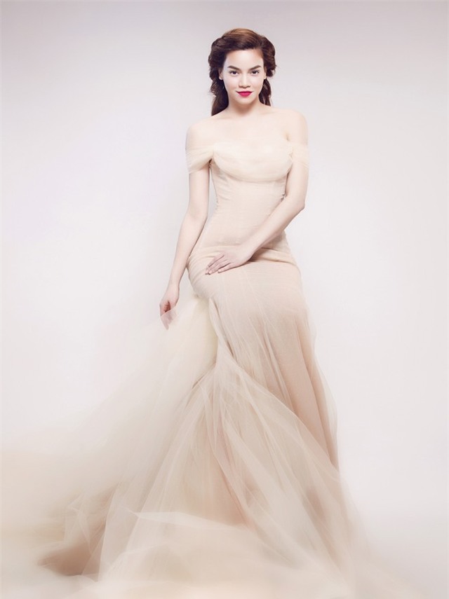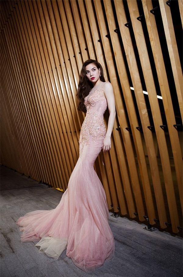 | Hà Hồ nhiều lần ghi điểm với trang phục màu hồng phớt. Thiết kế trễ vai được điểm họa tiết hoa duyên dáng. |