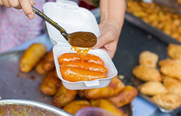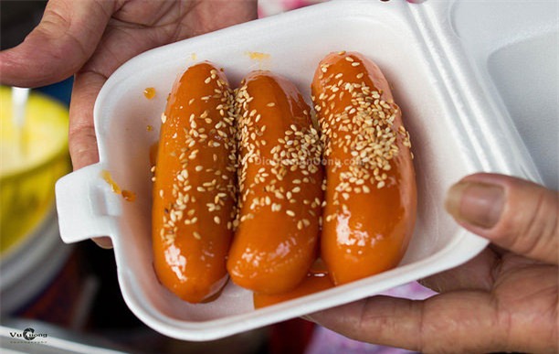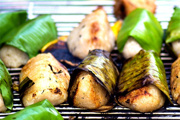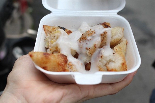 Chuối bọc nếp nướng chưa bao giờ bị lãng quên trong danh sách món ăn vặt hấp dẫn vỉa hè. Những quả chuối được cuộn tròn trong lớp áo bằng nếp dẻo, nướng trên than hồng cho đến khi chín vàng và cháy cạnh. Người bán dùng kéo cắt chuối nếp thành từng khoanh vừa ăn, cho vào đĩa và rưới lên bề mặt lớp nước cốt dừa dẻo, ít đậu phộng giã nhỏ. Chỉ cần trộn đều là bạn có thể thưởng thức một cách ngon lành.