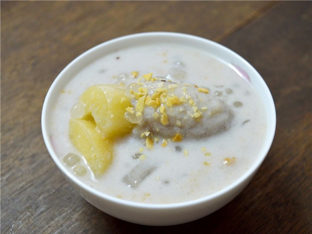 Cùng với chè đậu, chè khoai thì chè chuối cũng rất được lòng những người “hảo ngọt”. Nhắc đến món chè này, người ta nghĩ ngay đến vị ngọt của chuối, vị béo bùi của nước cốt dừa, đậu phộng xen lẫn độ mềm dẻo của những hạt bột báng tròn tròn nho nhỏ. Những nguyên liệu tưởng chừng đơn giản ấy khi hòa quyện với nhau lại tạo nên sự hấp dẫn khó có thể chối từ. Chè được múc vào bát, ăn nóng là tuyệt nhất.