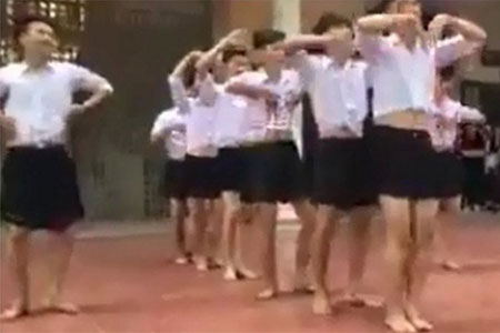 Nam sinh mặc váy ngắn nhảy tại trường học. Ảnh cắt từ clip. |