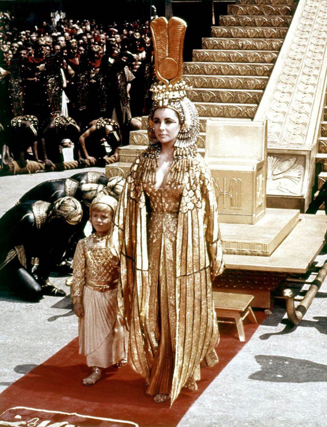 Elizabeth Taylor đã hóa thành bà hoàng đúng nghĩa trong phim "Cleopatra" với bộ trang phục vàng ánh kim đồ sộ và tinh xảo. Lộng lẫy cả một vùng trời như vậy, chẳng trách, tất cả phải quỳ rạp dưới chân người đàn bà quyền lực này.