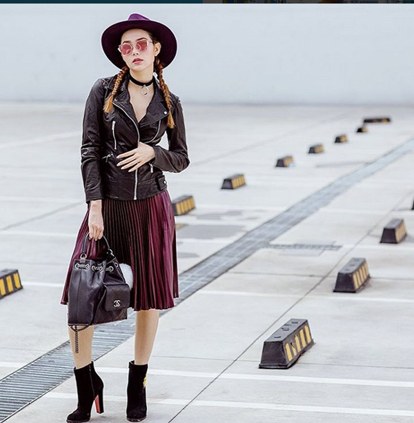 Minh Hằng mang đậm phong cách vintage, người đẹp chọn áo jecket da phối cùng chân máy midi và boots ngắn cổ