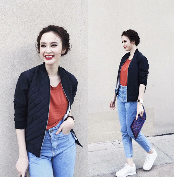 Ở set đồ này, Angela Phương Trinh trẻ trung và hiện đại khi cô chọn áo khoác bomber mix cùng giầy snacker