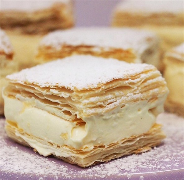Là lựa chọn số một để lót dạ bữa xế, những phần bánh Vanilla Slice được cắt khối vuông nhỏ với phần chính là bột bánh ngàn lớp và nhân kem custard. Độ ngậy béo và hương vị không lẫn vào đâu của những chiếc Vanilla Slice sẽ làm bạn mê mẩm và yêu ngay từ lần đầu tiên.
