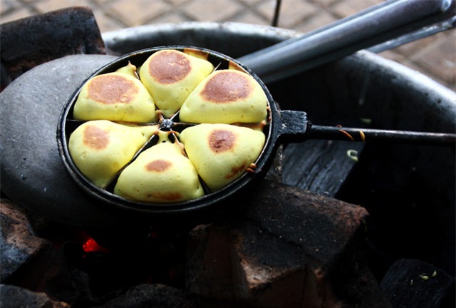 tráng đáy, đặt lên bếp than rồi đậy nắp lại, đợi cho bánh chín, tiếp