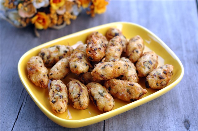 chảo dầu đang sôi. Vài phút sau đã có ngay món bánh bánh chiên giòn, vỏ