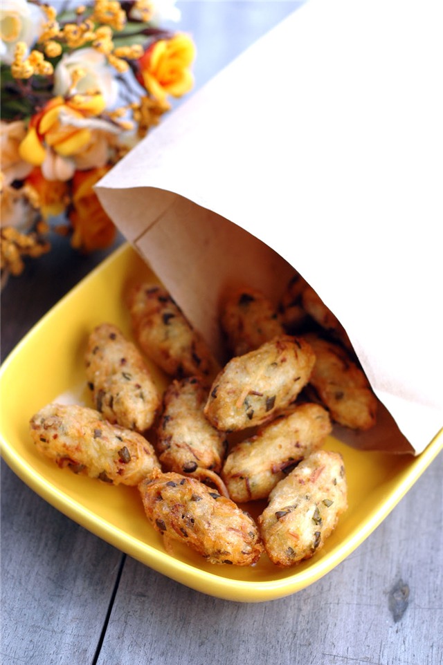 đều với củ sắn đã bào mịn, viên thành từng viên hình bầu dục rồi chiên