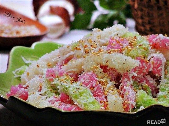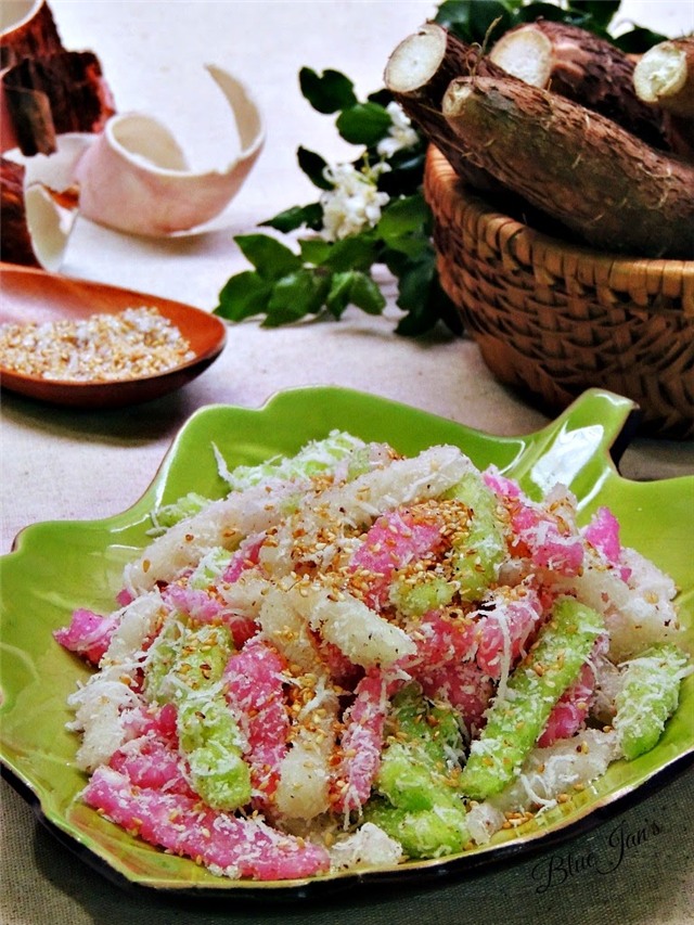 làm từ khoai mì trộn bột gạo nếp, dừa sợi, thêm ít lá dứa để tạo màu