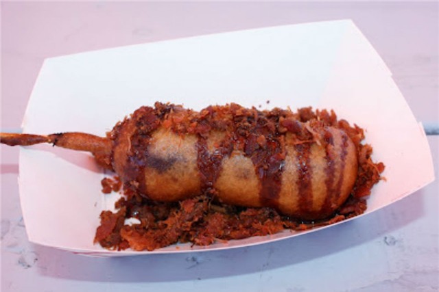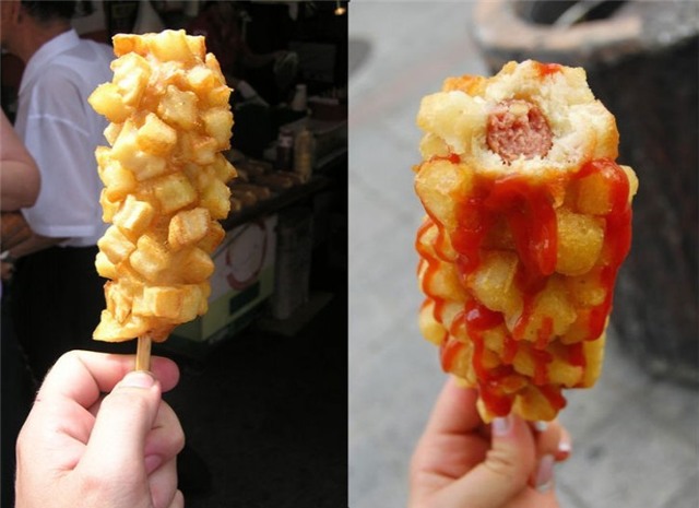 Khó có thể tìm được một cái tên chính xác để gọi tên của đồ ăn vặt hay ho này. Fry Dog là món ăn xuất hiện lần đầu tại Texas vào năm 2014. Món ăn là sự kết hợp của xúc xích với lớp khoai tây chiên xắt hạt lựu bọc bột rồi chiên đến giòn. Một que xúc xích khoai tây sẽ làm bất kỳ ai cũng thấy thích thú. Nhất là với hình dáng bắt mắt và sốt tương ớt ăn kèm.