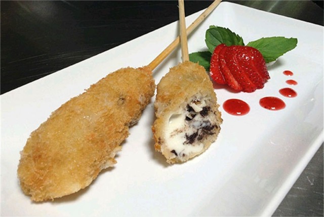 Nghe qua thì có vẻ thanh cá chiên là một món ăn bình thường không có gì đáng chú ý. Nhưng thực tế, bạn sẽ nghiện món ăn đặc biệt này khi cắn miếng đầu tiên bởilớp vỏ giòn là vị socola ngọt lịm tim và phần kem tan chảy trong miệng. Có thể bạn nghĩ món ăn này có hương vị hơi lộn xộn, tuy nhiên nó là một món chiên khó chối từ.
