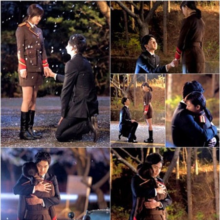 | Lee Seung Gi quỳ gối cầu hôn Ha Ji Won dưới hàng cây anh đào trong bộ phim truyền hình The king 2 hearts. |