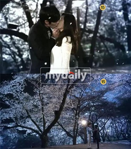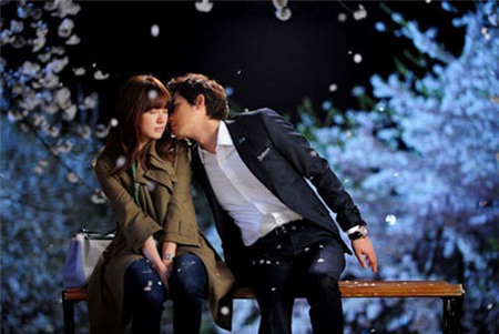 | Những cánh hoa anh đào bay như khiến nụ hôn má của Kang Ji Hwan và Yoon Eun Hye trong Lie to me thêm phần lãng mạn. |