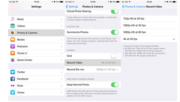 Do đó, khi muốn tiết kiệm bộ nhớ, bạn chỉ muốn quay video 1080p thôi chẳng hạn. Nhưng việc chuyển đổi từ 4K về 1080p hay ngược lại không dễ chút nào. Bạn phải thoát khỏi ứng dụng Camera, vào Settings, sau đó cuộn xuống cả một danh sách dài các ứng dụng, tìm "Camera", điều chỉnh chất lượng quay, thoát Settings rồi mở Camera lại từ đầu! Quá sức loằng ngoằng.