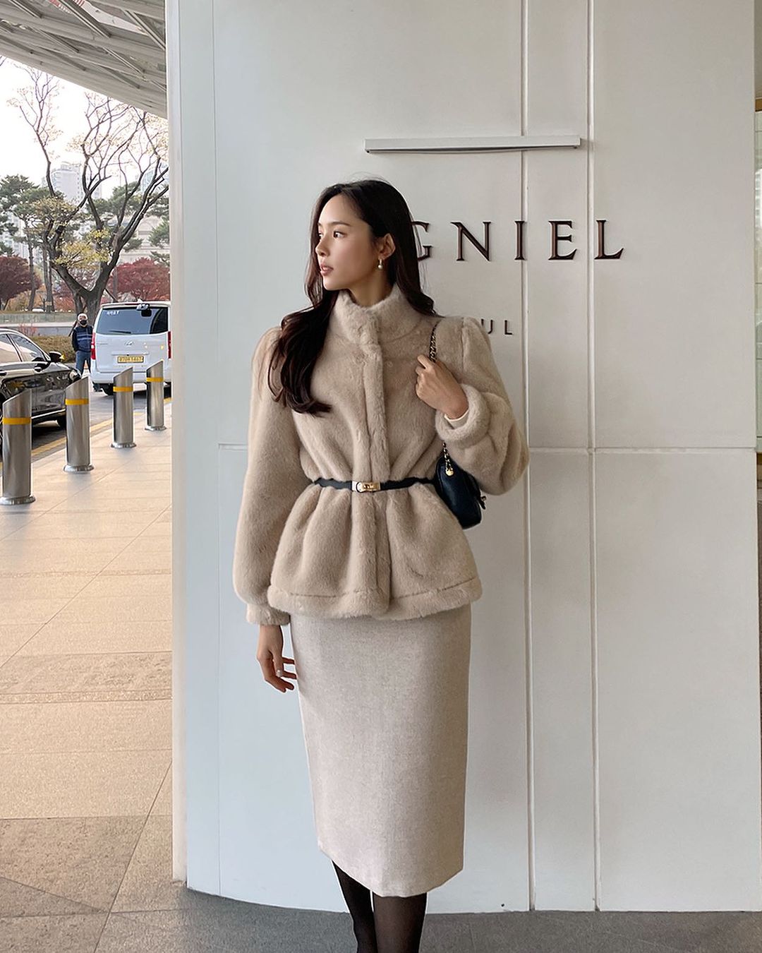 Những cô nàng sang chảnh có thể học nàng blogger này diện áo khoác lông mix cùng chân váy len hoặc dạ dáng dài. Bạn đừng quên dùng thêm 1 chiếc thắt lưng bên ngoài áo khoác để set đồ trông gọn gàng, thanh lịch hơn