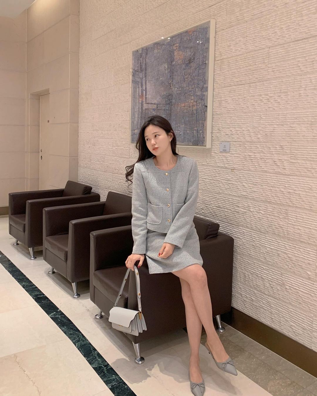 Set đồ vải tweed trang nhã, tông xanh mềm mại được cô nàng này mix cùng những món phụ kiện cùng tông. Set đồ này đủ trẻ trung, năng động mà vẫn thanh lịch, tôn dáng để diện đi dự tiệc với công ty, bạn bè, gia đình, họ hàng