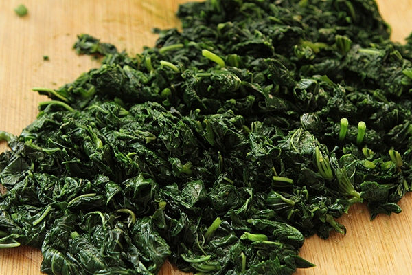 Sau khi lá rau lang nguội, vắt kiệt nước rồi thái nhỏ.