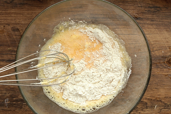 Đập trứng vào bát tô, thêm bột mì và nước lọc vào khuấy đều.