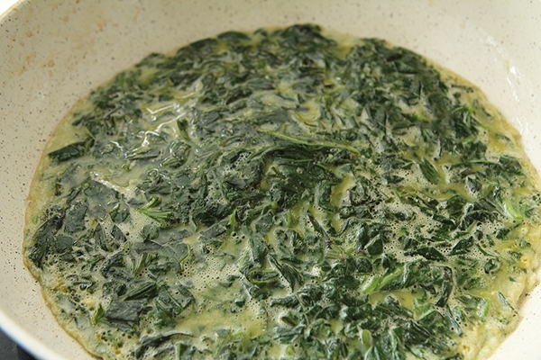 Đổ lượng dầu thích hợp vào chảo đun nóng, đổ trứng đã trộn rau lang vào dàn đều sau đó chiên ở lửa nhỏ, khi chín vàng một mặt thì lật mặt để chiên chín mặt còn lại.