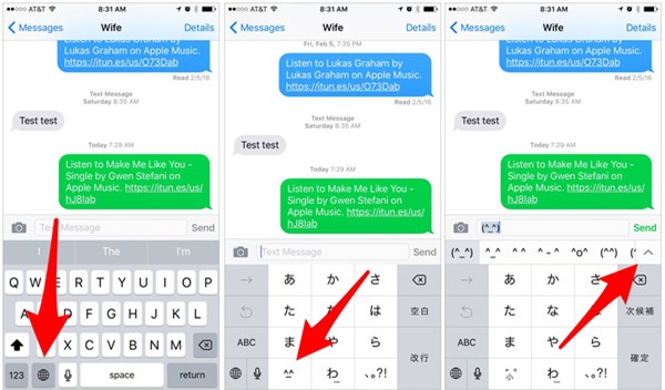 Hãy chuyển đến bàn phím Kana, nhấn vào nút ^_^ để vào tùy chọn chèn các emoticon. Bạn còn có thể nhấn vào nút ^ như hình minh họa trên để iPhone hiển thị một danh sách đầy đủ các emoticon cho dễ sử dụng hơn.