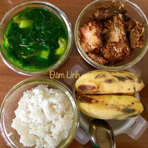 Nhiều người chọn ăn ngoài hàng nhưng Linh vẫn nhất quyết không. Các món ăn cô mang đi cũng không nhiều loại, đa số chủ đạo là 1 món mặn: cá kho, thịt tẩm ngủ vị áp chảo, cá om dưa và 1 món rau. Linh chia sẻ, mình làm hông hề nhiều món vì không phải món nào cũng ngon khi để từ sáng tới trưa, nhưng cô rất cố gắng cân bằng để ăn được nhiều rau hơn mỗi ngày.