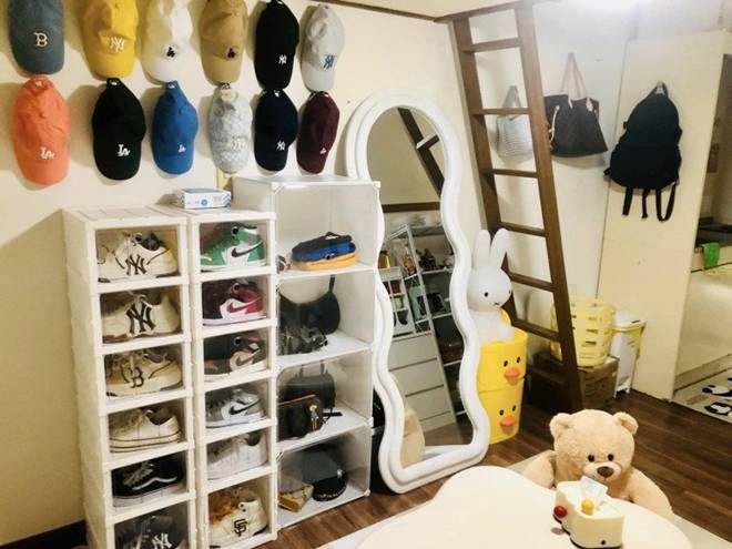 Bên phải ghế sofa là hệ thống kệ, tủ đựng bát đĩa, cốc và một số thiết bị nấu nướng. Đối diện bàn và ghế sofa, chị Hường đặt gương, tủ đựng giày và túi xách, phía trên thì treo mũ lưỡi trai của các nhãn hiệu nổi tiếng. Mỗi món đồ đều được sắp xếp gọn gàng, ngay ngắn thẳng hàng. Nhìn qua cũng biết cô nàng 9X này là một người thích sưu tập giày thể thao và mũ lưỡi trai.