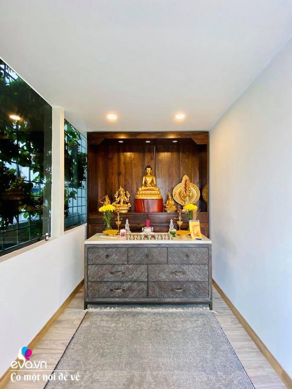 Là người coi trọng những giá trị linh thiêng, chị Hương khéo léo thiết kế và bài trí không gian thờ tựu ở một nơi trang trọng thể hiện thành kính sâu sắc. Đây cũng là nơi để chị dành thời gian ngồi thiền và cầu nguyện. Chị nói: “Phòng thờ luôn là khu vực tâm linh không thể thiếu và ngày nay khi cuộc sống càng nâng cao thì nơi đây càng trở nên quan trọng”.