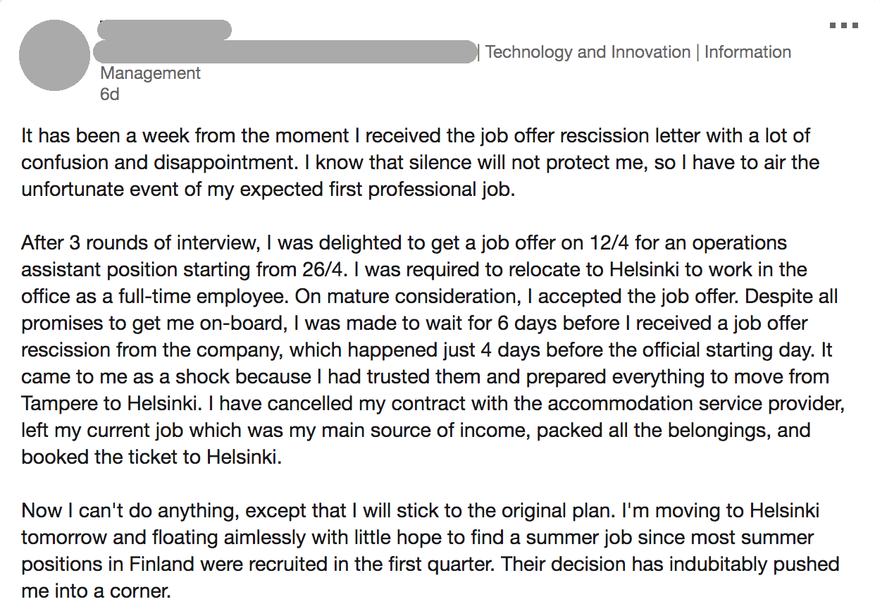 Khi cân nhắc kĩ càng, tôi đã chấp nhận lời đề nghị. Thế nhưng bất chấp mọi lời hứa trước đó, sau 6 ngày chờ đợi tiếp theo, tôi nhận được thư huỷ hợp đồng làm việc từ công ty và điều này xảy ra chỉ 4 ngày trước khi công việc chính thức bắt đầu. Nó như một cú sốc vì đã tin tưởng họ và chuẩn bị hết mọi thứ để chuyển từ Tampere (nơi ở trước đó của T.N) đến Helsinki. Tôi đã hủy hợp đồng với nhà cung cấp dịch vụ lưu trú, rời bỏ công việc hiện tại - nguồn thu nhập chính của tôi, thu dọn đồ đạc và đặt vé đến Helsinki.