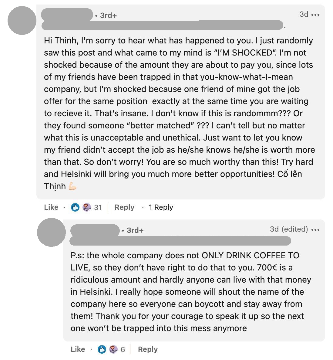 P/s: Cả công ty không chỉ uống cà phê để sống, vì vậy họ không có quyền làm điều đó với bạn. 700 EUR cũng là một số tiền vô lý và khó ai có thể sống với số tiền đó ở Helsinki. Tôi thực sự hy vọng ai đó sẽ gọi tên công ty đó ở đây để mọi người có thể tẩy chay và tránh xa nó. Cảm ơn bạn đã can đảm nói lên điều đó để mọi người sẽ không bị mắc kẹt vào mớ hỗn độn này nữa".