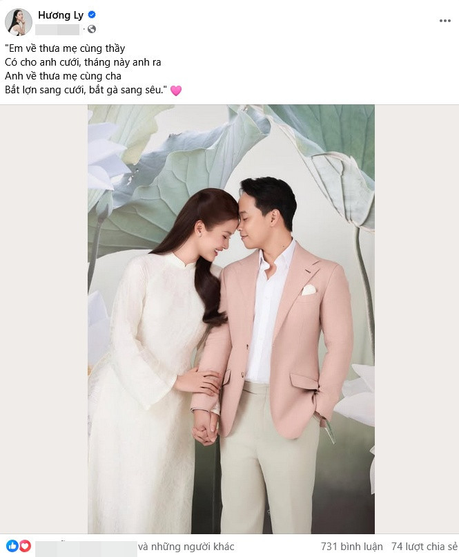 Được biết, trước khi tiến tới hôn nhân, cả hai đã có thời gian dài bí mật hẹn hò. Hồi tháng 9 vừa qua, Hương Ly lần đầu để lộ diện mạo ông xã. Cô đăng hình ảnh thân mật bên đàng trai kèm dòng trạng thái thông báo sắp có hỷ: "Em về thưa mẹ cùng thầy. Có cho anh cưới, tháng này anh ra. Anh về thưa mẹ cùng cha. Bắt lợn sang cưới, bắt gà sang sêu."