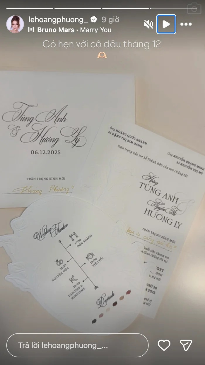 Mới đây, hoa hậu Lê Hoàng Phương chia sẻ hình ảnh thiệp cưới của cô dâu tháng 12 không ai khác chính là Hương Ly.