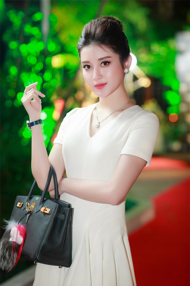 Cô chọn bộ đầm màu kem trang nhã của thương hiệu Dior, kết hợp cùng túi Hermes, giày Fendi - đều là những thương hiệu thời trang danh tiếng.