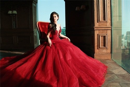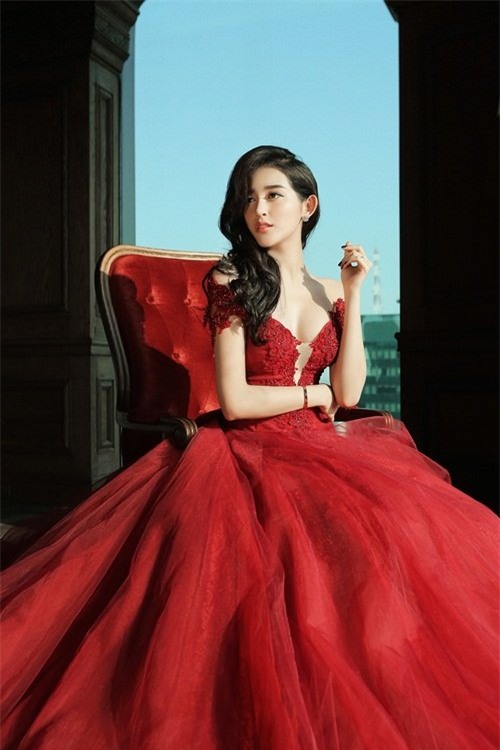 Chiếc đầm đỏ với phần chất liệu voan, lụa được xử lý kỹ, phom dáng bồng bềnh, sang trọng, làm nổi bật làn da trắng và vẻ cuốn hút của người mặc