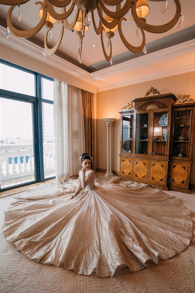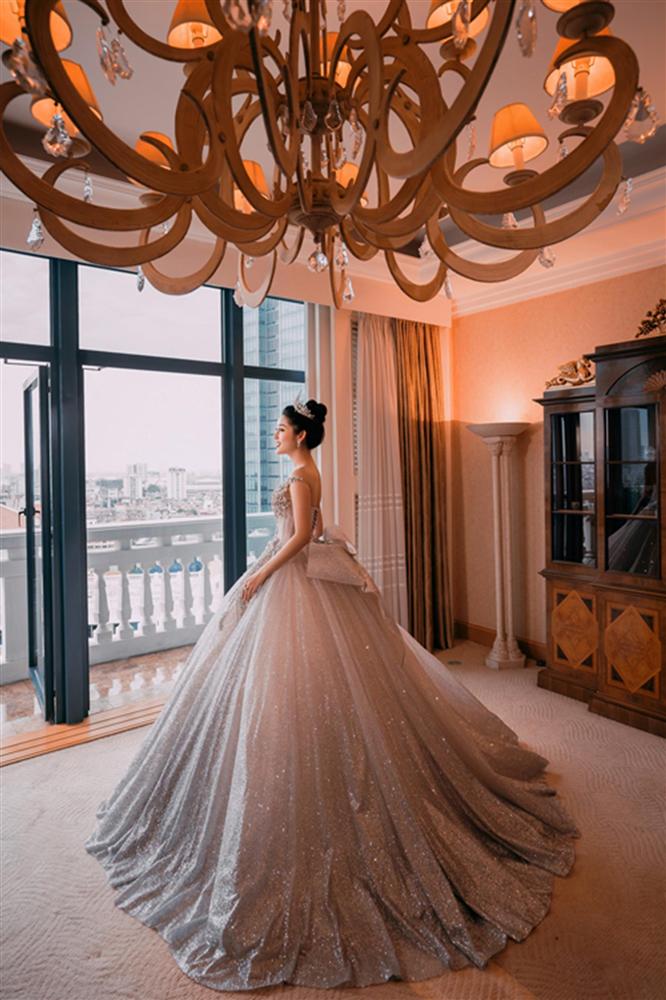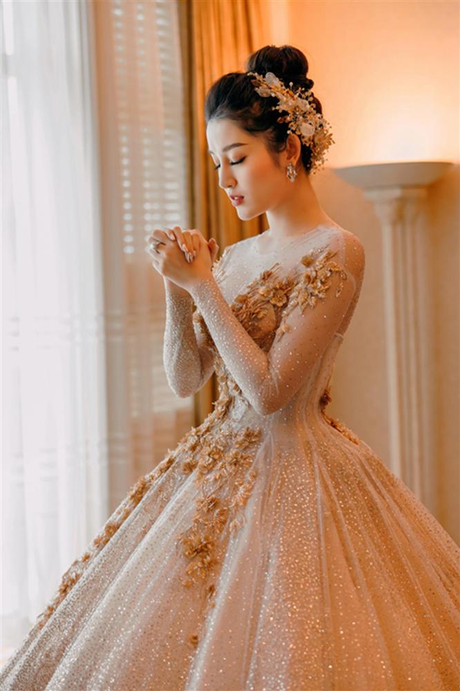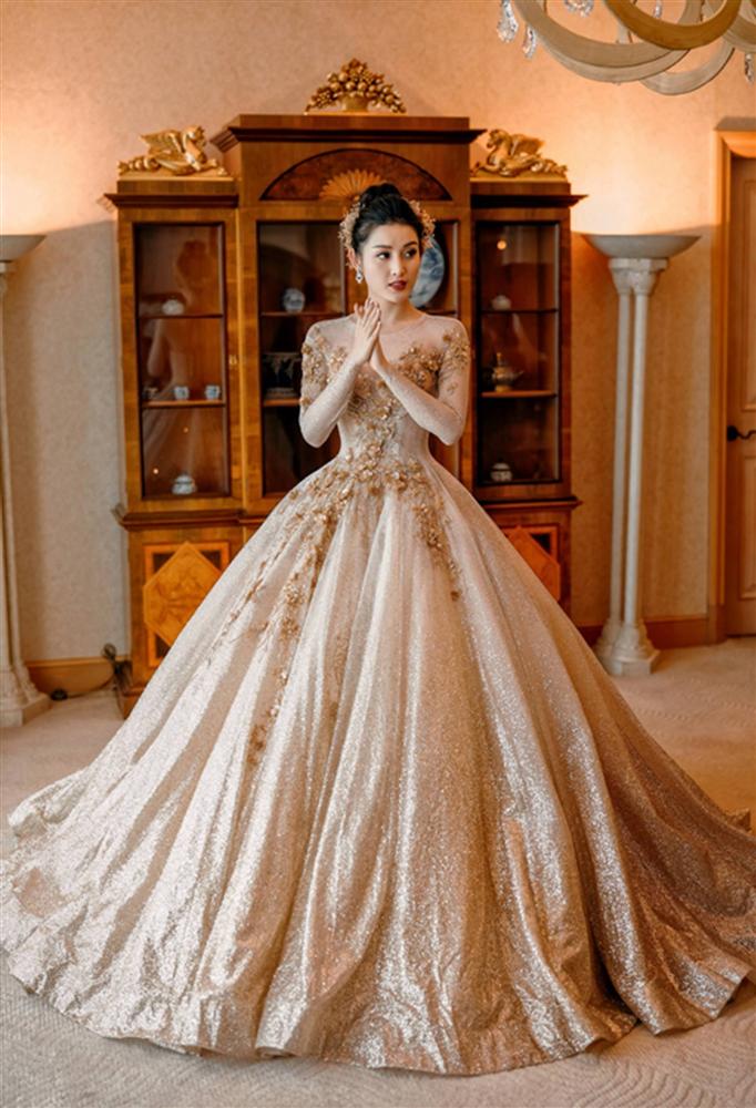 Váy cưới xòe bồng công chúa với chất liệu ánh kim lộng lẫy 'hô biến' Á hậu Huyền My thành nàng công chúa bước ra từ câu chuyện cổ tích ngày xưa. Bộ váy được nhà thiết kế tạo hình cổ hai trong một để khoe khéo nét đẹp của cô dâu trong ngày cưới.