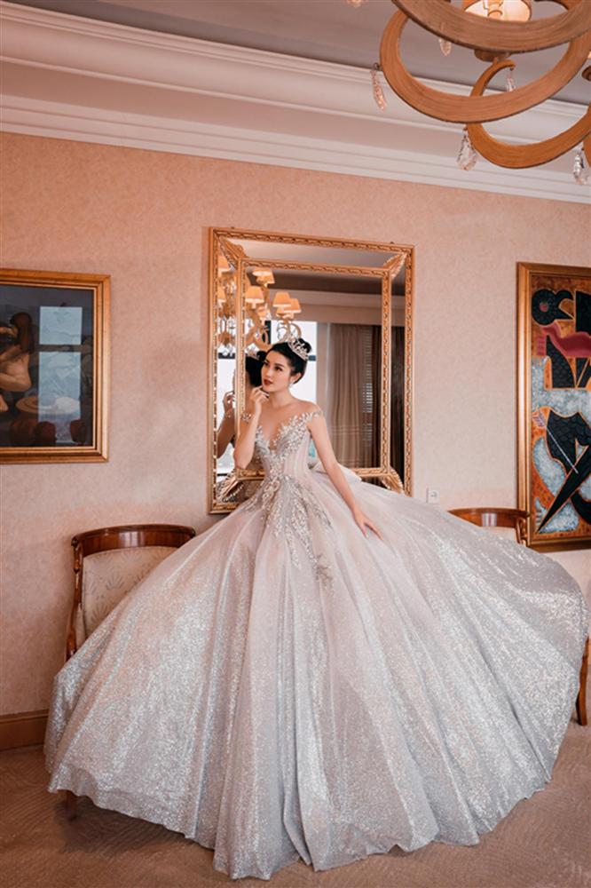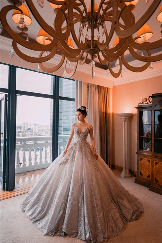 Một thiết kế váy xòe công chúa khác với tông bạc trắng lấp lánh mang đến vẻ sang trọng, kiêu sa cho người mặc. Chiếc váy có trọng lượng lên tới 25 kg.