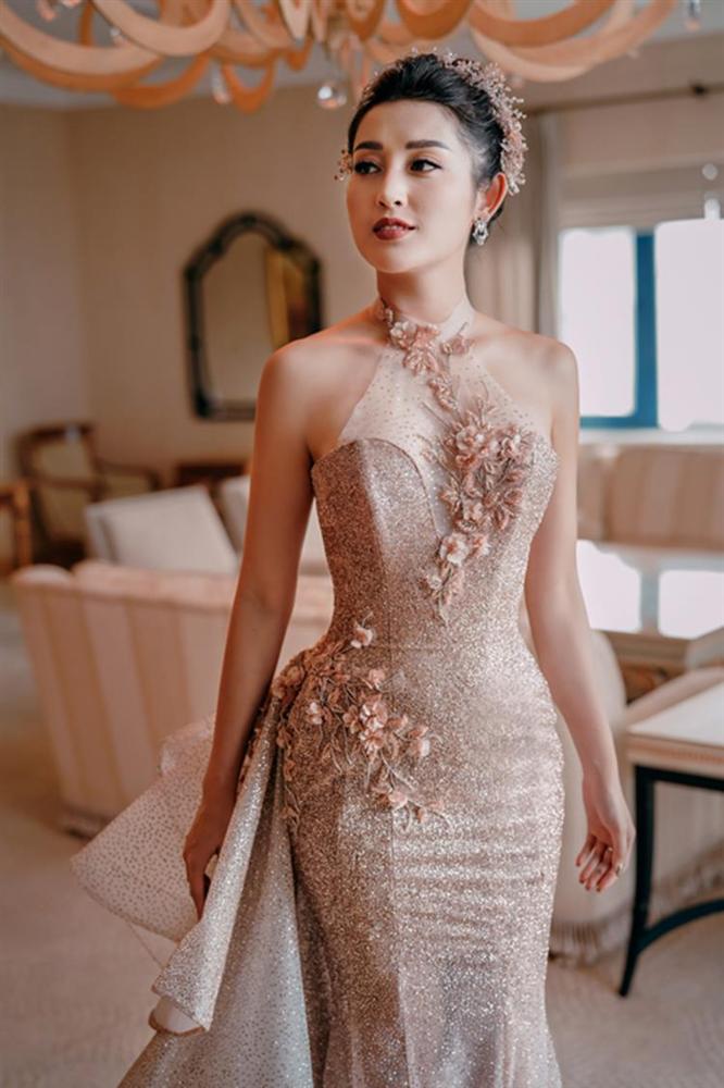 Á hậu Huyền My khoe vẻ đẹp "nữ thần" với thiết kế này. Mẫu váy được khai thác theo phom dáng corset, tôn lên vẻ đẹp hình thể của người phụ nữ. Họa tiết ren đính đá và thêu nổi nơi ngực áo tạo sự kiêu sa và hơi hướng phương Tây cổ điển