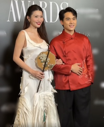 Xuất hiện trên thảm đỏ, vợ chồng Á hậu Chế Nguyễn Quỳnh Châu gây chú ý. Người đẹp diện đầm màu trắng chất liệu lụa bóng. Trong khi đó, ông xã doanh nhân diện áo dài đỏ. Cả hai thoải mái thể hiện tình cảm, dính nhau như sam ở sự kiện.